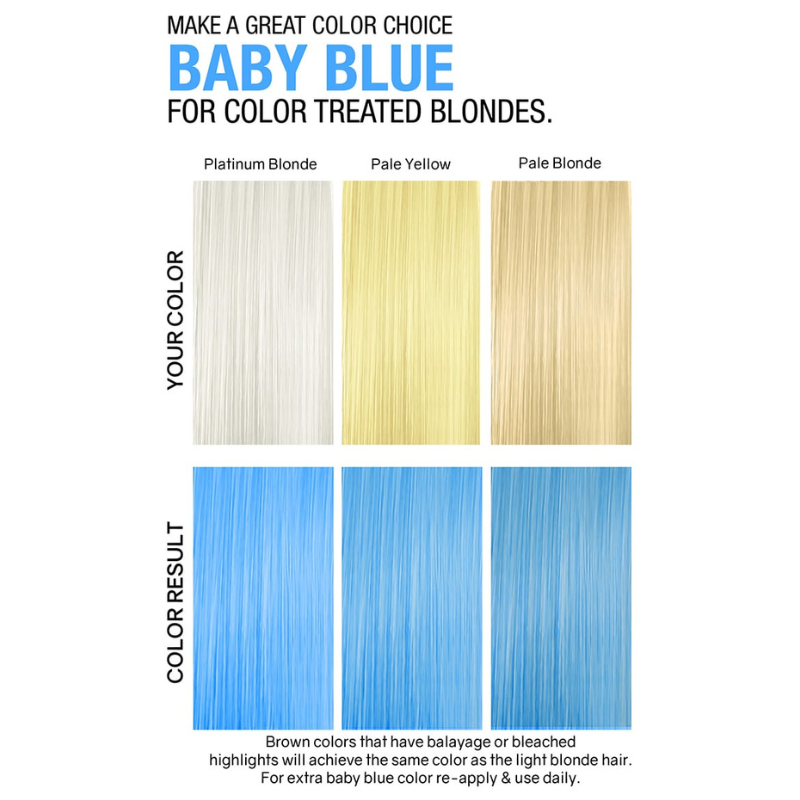 • Baby Blue will not have a result on brown hair without bleached highlights.