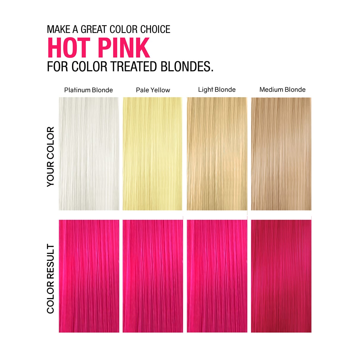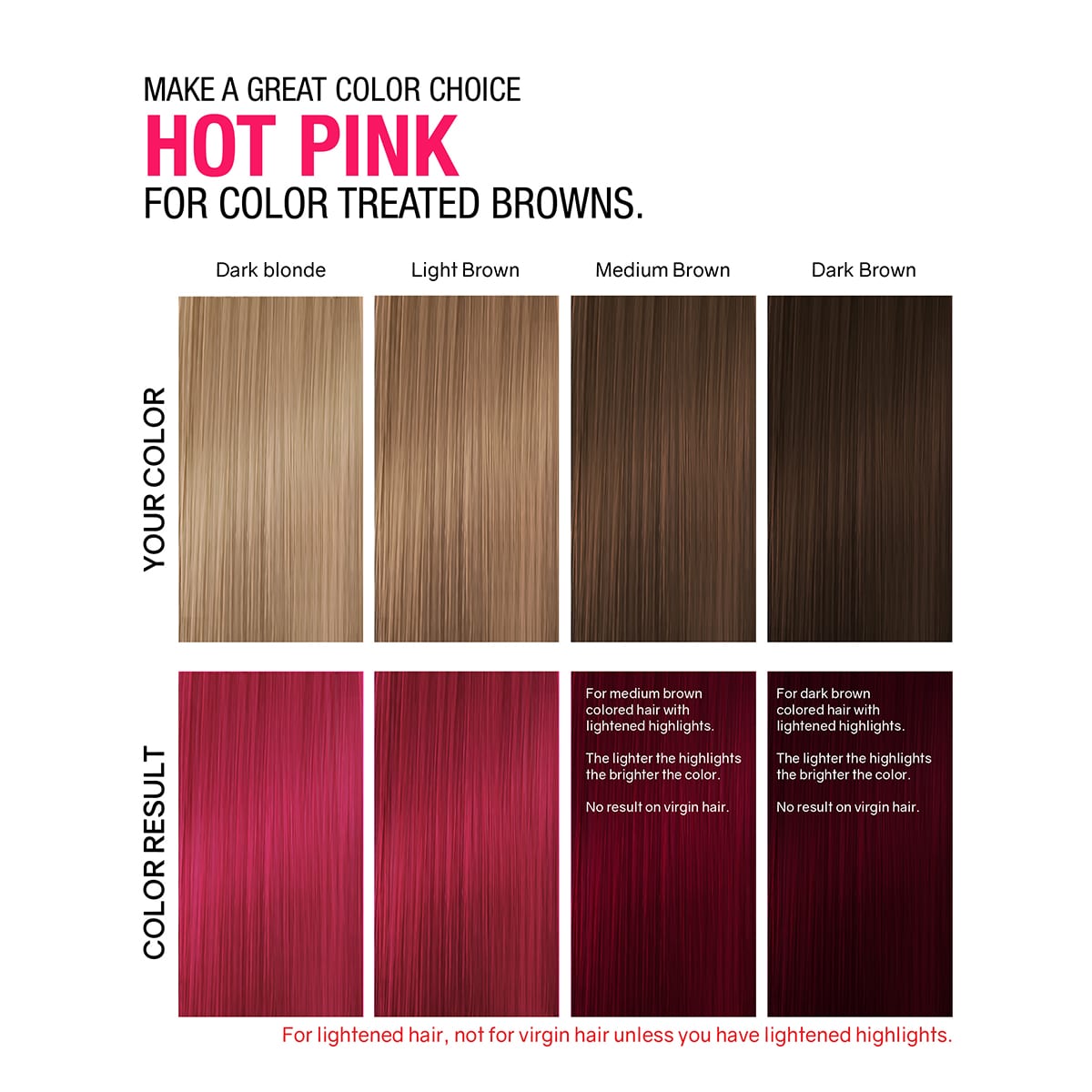 On color treated brown hair you will get a tone of Hot Pink color. Brightest results on brown hair that has lighter bleached or color treated highlights