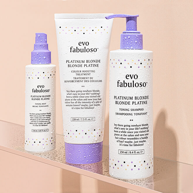 fabuloso platinum blonde toning mist is a super lightweight, leave-in spray that ever so gently tones to keep any shade of blonde hair light and bright. designed to be used alongside the platinum blonde toning shampoo and/or colour boosting treatment, this vegan toning mist contains just the right amount of violet pigment to softly tone blonde, gray or lightened hair while detangling, moisturising, adding shine and protecting against uv and heat damage. gentle enough for daily use, toning mist can be used to quickly refresh your style, or for extra conditioning and even blonder results. the evo fabuloso platinum blonde trio is here to tone brass, repair damage and bring out the best of your blonde.